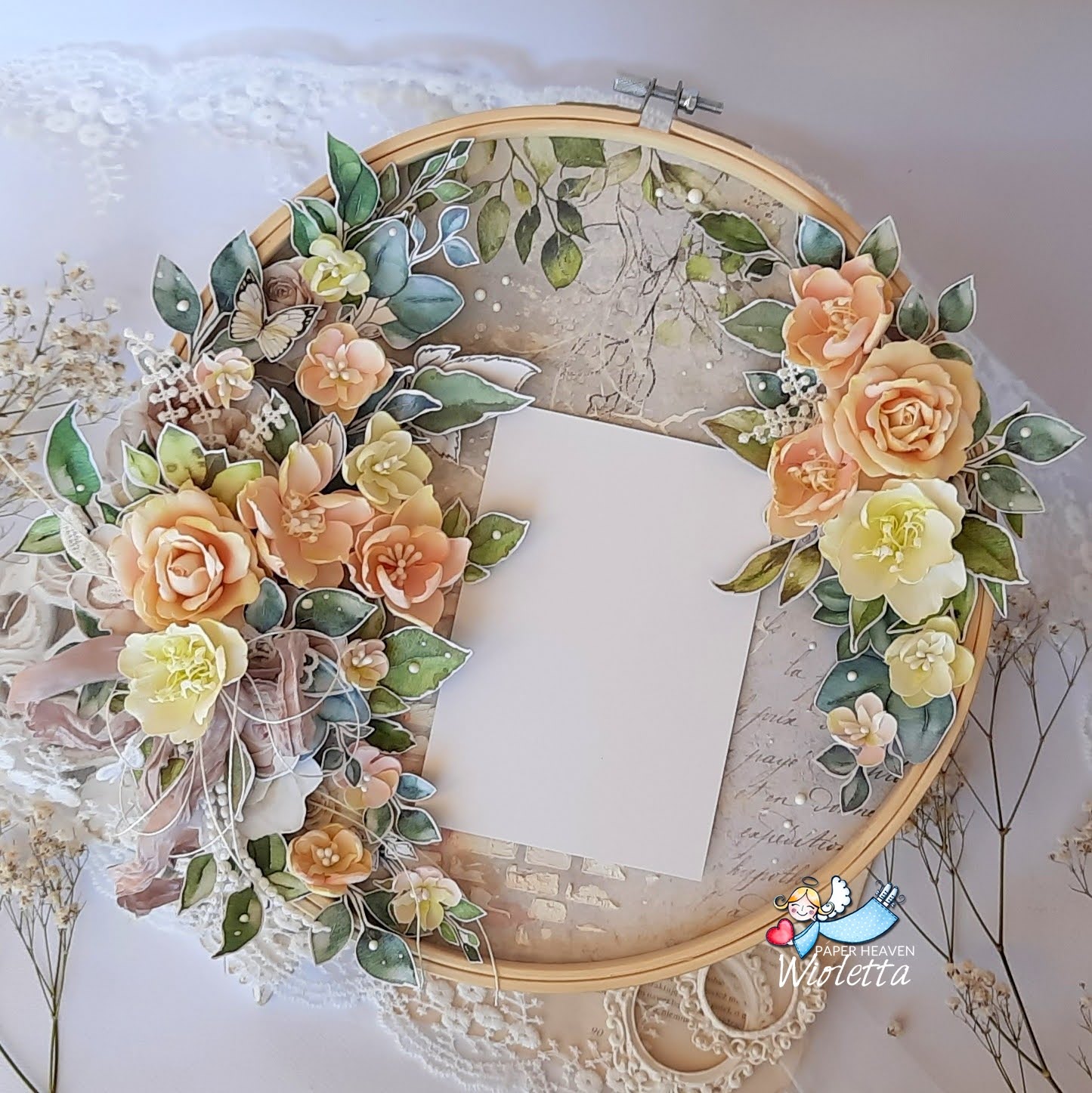 Święta minęły szybko a dziś chciałabym pokazać już Wam nieświąteczną inspirację, jaką przygotowałam dla DT Paper Heaven. Jest nią mocno ukwiecony tamborek. Zrobiłam go na bazie papieru z kolekcji W głębi lasu. Kwiaty uzupełniłam wyciętymi z dodatków listkami, które pięknie budują całą kompozycję.